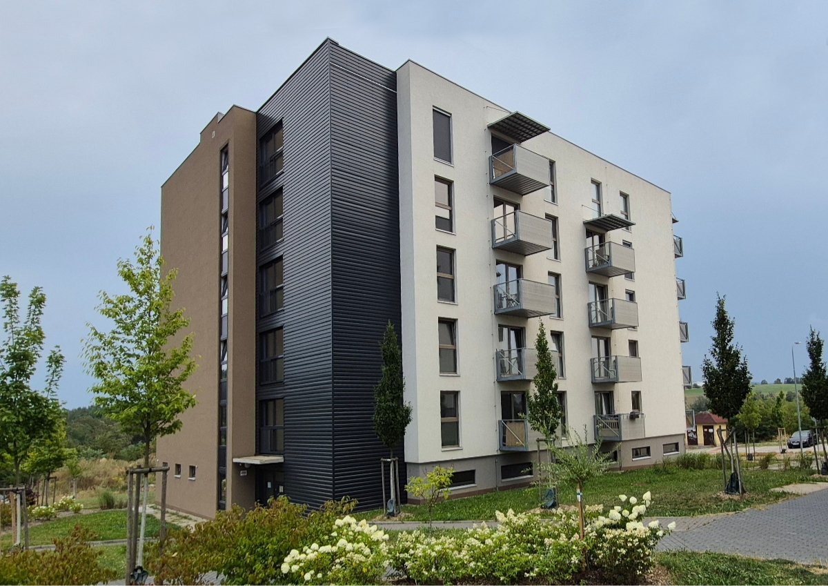 Objekt se vyznačuje moderním architektonickým řešením fasády, která kombinuje bílou a pastelově přírodně hnědou barevnost. Tyto světlé odstíny doplňuje oplechování v kontrastním antracitovém provedení. Výrazným prvkem jsou prostorné závěsné balkony, jejichž horní úrovně jsou kryté subtilní stříškou. Zámečnické prvky balkonových konstrukcí byly provedeny s vysokou precizností a podílejí se na celkovém estetickém i technickém standardu budovy.
